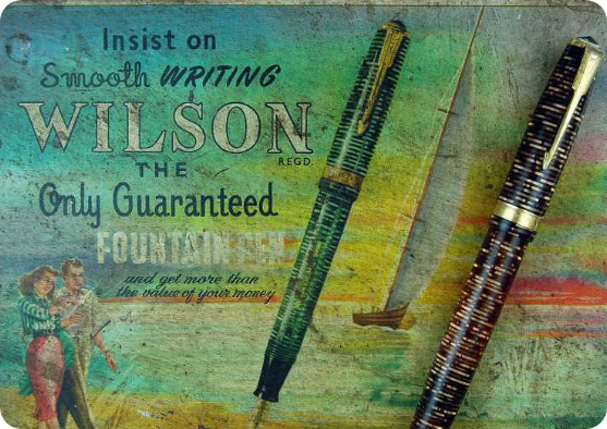 A colourful Wilson box used to display and sell ten pens at a time, seen here with one on top
