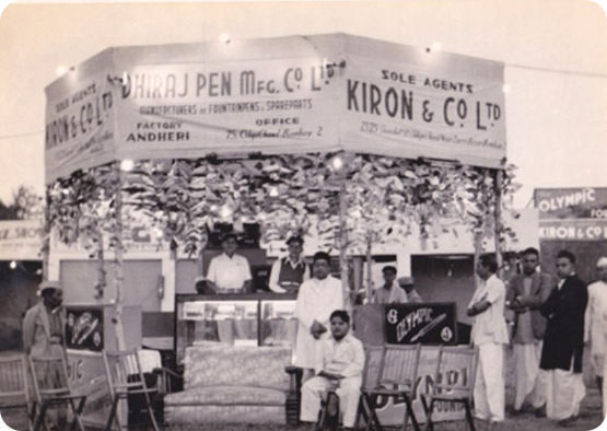 Dwarkadas Jivanlal Sanghvi (Standing right in a black coat) with his brother Vallabhdas Jivanlal Sanghvi and business partners, at a Pen Exhibition in Bombay. Circa1951